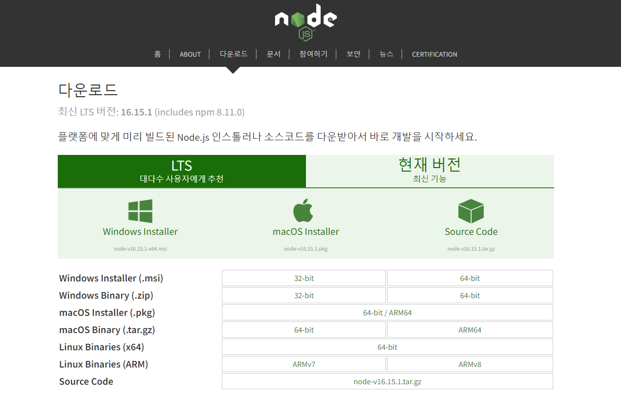 본인이 사용하는 OS와 버전에 맞게 다운로드하여 설치한다. 안정적인 버전인 LTS버전을 다운받는 걸 추천한다.^^