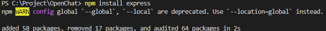 Local설치를 위해 해당 프로젝트 폴더를 열고 터미널에 npm install express 를 입력한다.