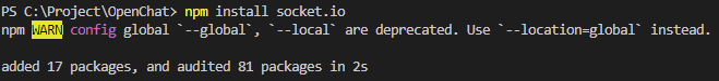 Local설치를 위해 해당 프로젝트 폴더를 열고 터미널에 npm install socket.io 를 입력한다. (IDE = VisualStudioCode)