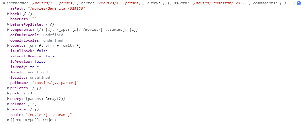 console로 router를 찍어봤을 때, asPath 의 값으로는 /movies/{title}/{id}가 들어갔고 route를 보면 /movies/[...params] 라고 나와있는 걸 볼 수 있다. router로부터 정보를 받기 때문에 새로 고침 시 client에서 값이 없을 수 있으므로 params || [] 빈 Array를 설정해줘야한다.