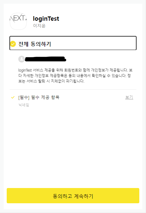 예시로 닉네임만 받는걸로 설정해두고 동의화면 미리 보기를 클릭하면 아래와 같이 미리 보기를 확인할 수 있다.