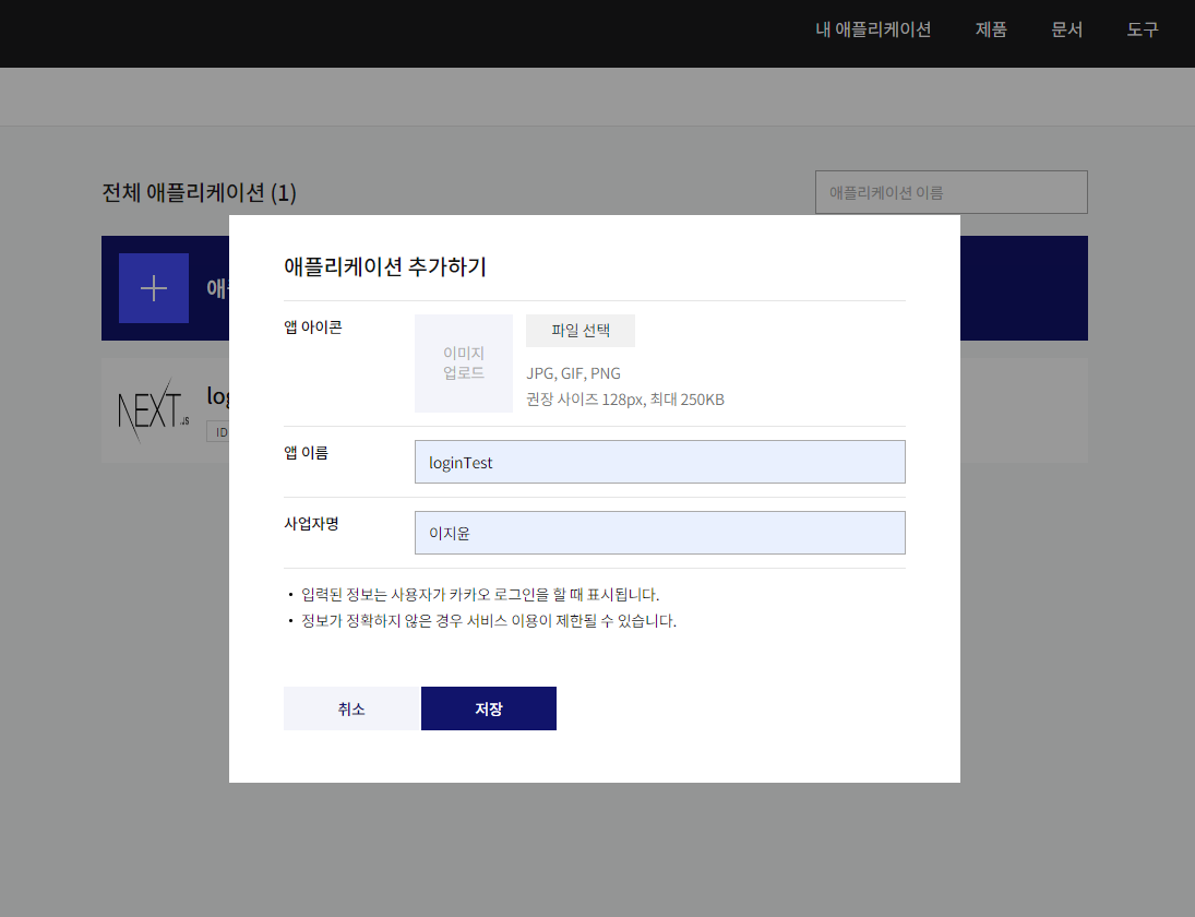 앱이름 입력하고 사업자명에는 그냥 내이름을 입력한 후 저장했다.