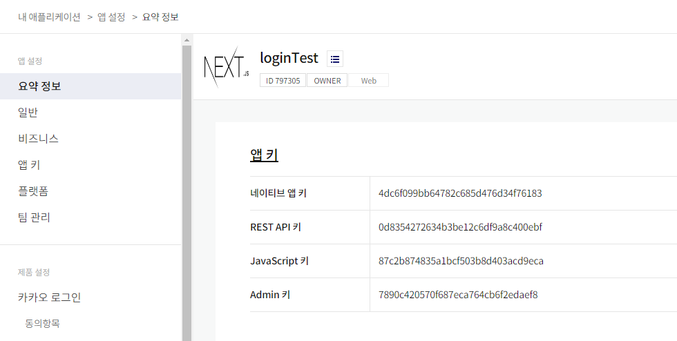 요약 정보를 보면 내 애플리케이션에 할당된 키 값 들을 볼 수 있다.