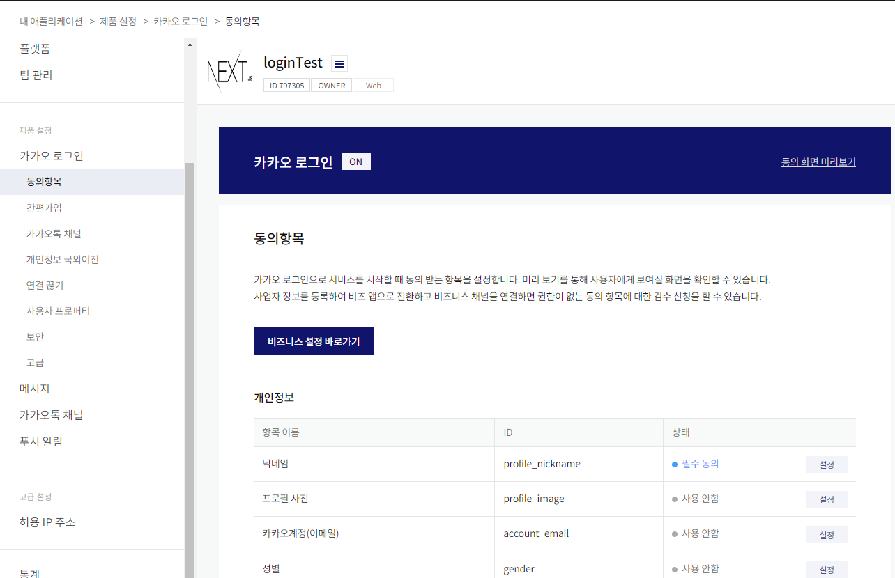 로그인 시 얻어올 정보들에 대한 동의 항목들은 아래 화면에서 설정 할 수 있다.
