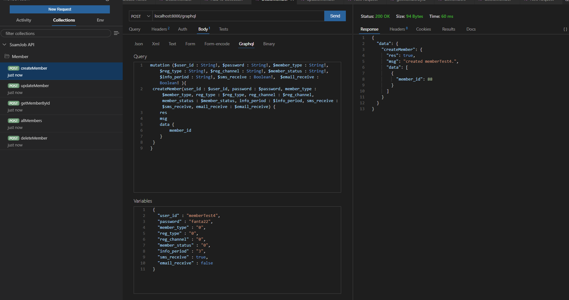 Member라는 모델을 만들어 해당 멤버관련 controller를 구현하여 호출하도록 만들었다. ORM으로 sequelize 를 사용하고 있으며 sequelize 관련해서는 다음 글에 포스팅 하겠다. 구현된 resolver들을 보면 root를 '_'로 void타입으로 받고 뒤에 argument를 받아 정보를 넘겨준다. 해당 argument는 graphql 쿼리로 부터 받은 정보와 일치한다.