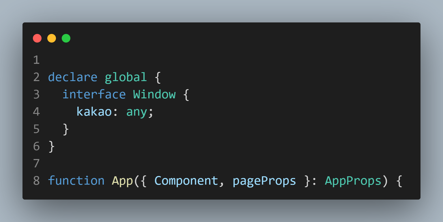 window.kakao를 사용하기 위해 전역변수로 kakao를 추가해 준다. 보통 전역변수는 _app.tsx에 선언해준다고 한다.