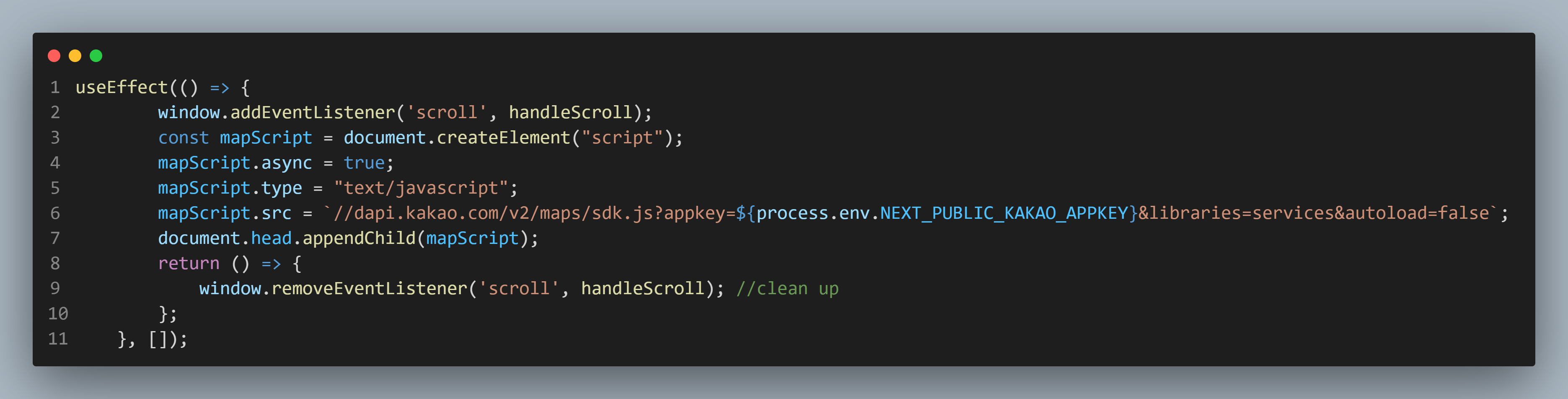 처음에 기존방식이 아니라 React나 Next에서는 어떻게 script를 넣지 하면서 난감해했는데 찾아보니 Page 컴포넌트 내에서 UseEffect로 최초 호출 시 document에 append 하는 방법을 취하고 있었다.